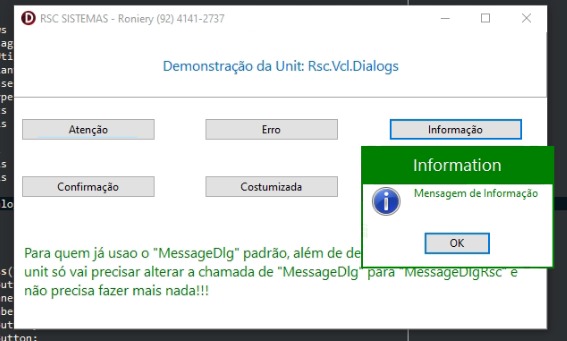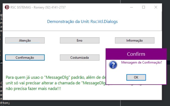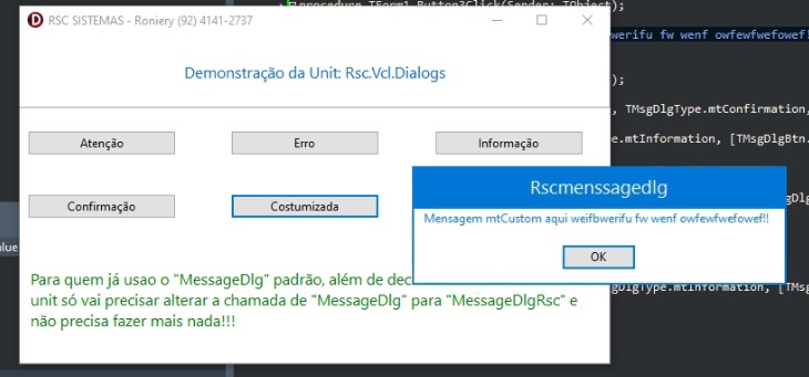 A MessageDlgRsc é uma biblioteca desenvolvida em Delphi VCL, projetada para substituir ou complementar a função MessageDlg padrão, oferecendo recursos visuais avançados e maior controle sobre a interface das mensagens exibidas. Com total compatibilidade com versões do Delphi a partir do XE, a biblioteca permite exibir diálogos com ícones personalizados, cores temáticas, estilo moderno, e ainda mantém a mesma estrutura e assinatura da função nativa, facilitando a integração com projetos já existentes. Ideal para desenvolvedores que desejam oferecer uma experiência mais moderna e atrativa ao usuário final, sem abrir mão da estabilidade da VCL.